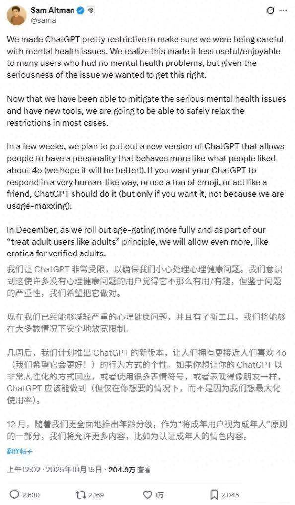 奥尔特曼表示:“随着我们进一步推出年龄验证机制,并秉持‘把成年人当作成年人对待’的原则,我们将允许更多内容,例如为经过验证的成年人提供情色对话功能。”